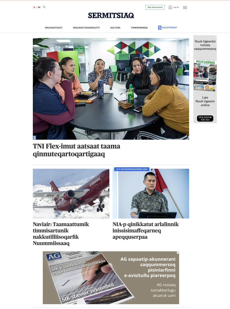 Sermitsiaq.gl er Grønlands største uafhængige mediehus. Med to landsdækkende aviser, to magasiner, en lokalavis og to nyhedssites sørger vi for, at du kan nå ud til netop din målgruppe. Nedenfor finder du en beskrivelse af vores forskellige medier. Der er naturligvis mulighed for at annoncere i flere medier på en gang, herunder at kombinere net og print.