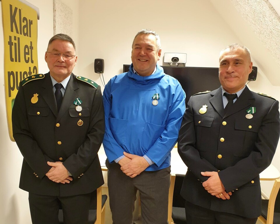 Chefpolitiinspektør Jørgen Harlev kunne i alt uddele hæderstegnet til fem ansatte i Grønlands Politi, der hver især modtog det på deres respektive stationer: