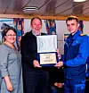 Den stolte maskinbesætning fik fredag overrakt pladen af skibsfører Poul Krogsgaard og administrerende direktør Jette Larsen. Maskinbesætningen består blandt andre af vedligeholdelseschef Per M. Nielsen, 1. mester Boas Poulsen, motormændene Enok Broberg og Kurt Titussen.