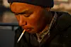 Enos med den obligatoriske smøg i mundvigen, da han sejler afsted tidlig morgen fra Tasiilaq.Foto: Oscar Scott Carl