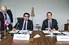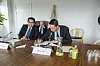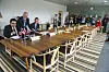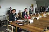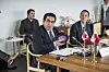 Naalakkersuisut medlemmerne Anda Uldum og Vittus Qujaukitsoq efter underskrivelsen af mineaftalen. I baggrunden sidder borgmester i Qeqqata Kommunia, Hermann Berthelsen, sammen bestyrelsesmedlem i Hudson Greenland James K. Cambon