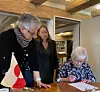 Inge Lynge underskriver overdragelsesdokumentet under overværelse af bestyrelsesmedlemmer i Inge og Hans Lynge Fonden,Birgit Kleist Pedersen og Nauja Lynge.Grønlands Nationalgalleri for Kunst