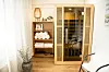 sauna bliver opvarmet via infrarøde carbon paneler. Carbon panelerne afsender