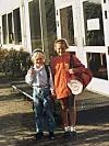 Første skoledag i Danmark for lillesøster Louise med Anne Nivíka ved sin side. Søstrene står foran den hal, familien boede i de første måneder efter flytningen til Tommerup på Fyn.Privat