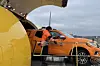 En af Beredskabsstyrelsens let genkendelige orange biler bliver kørt ud af fragtflyet i Nuuk Lufthavn.Foto: Beredskabsstyrelsen