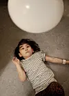 6-årige Inaluk Nathanielsen leger med en ballon på køkkengulvet i familiens vakantbolig.Foto: Oscar Scott Carl