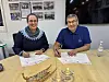 Kommunalbestyrelsesmedlem Lene Ravn Davidsen (D) og forperson for GIF, Claus Nielsen underskriver aftalen på vegne af Avannaata Kommunia og Grønlands Idrætsforbund.