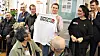 Mette Frederiksen får overrakt en t-shirt med skriften "SUPPORT GREENLAND" af foreningen Uaguts forperson, Julie Rademacher.
