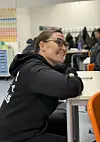 Stina Sværd taler med skoleelever under sin skolebesøg