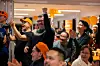 Forsamlingen er ligeledes i forrygende humør, som der kommer flere godkendte resultater ind, og der er musik og dans.