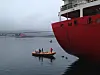Da 'Naja Arctica' kom til udmundingen af Godthåbsfjorden i morges, den 9. juli, blev fragtskibet fulgt ind til byen af to gummibåde fra politikutteren Sisak. Gummibådene fulgte fragtskibet helt, indtil det lå ved kaj i Nuuk.