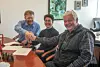 Konstitueret kommunaldirektør Kenneth Høegh (tv), borgmester Kiista P. Isaksen og direktøren for HEE Entreprise A/S, Erling Madsen, der skal anlægge de nye kunstgræsbaner, giver her hånden efter at have skrevet under på kontrakten.