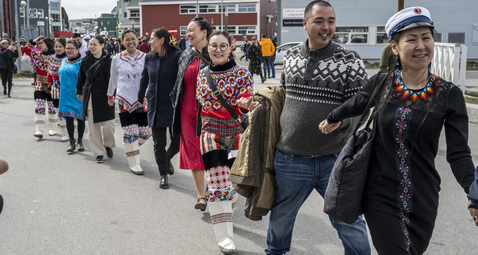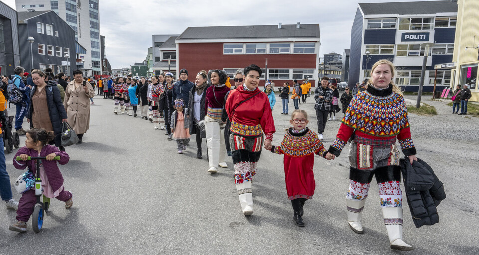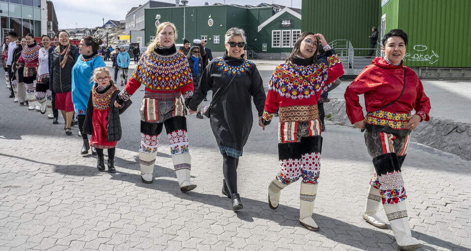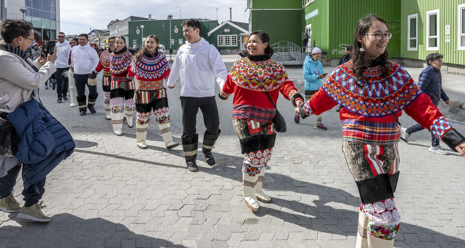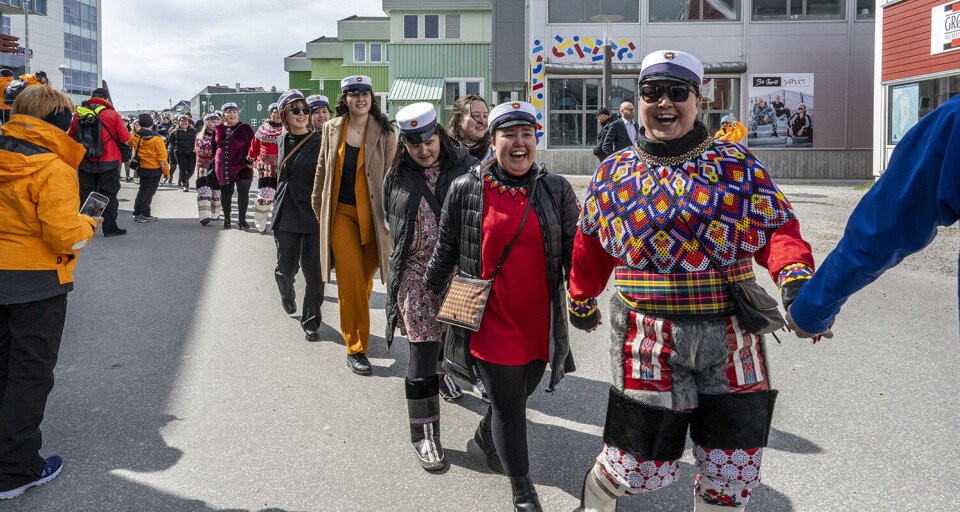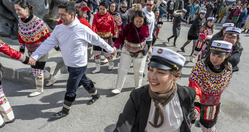 Nationaldragten og smukke grønlandske flag kom flittigt i brug, da de glade og stolte dimittender kl. 11.00 vandrede i procession fra Greenland Business School på Aqqusinersuaq 18 til Hans Lynge Salen i Katuaq.