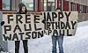 Watson-tilhængere foran retten ønsker ham tillykke med fødselsdagen.Foto: Leiff Josefsen