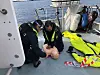 Fra øen bjærger styrmanden en tilskadekommen ”person” – en dukke iført en stor redningsdragt, og med det samme begynder de to søfolk at yde førstehjælp.