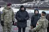 Forsvarschef Michael Hyldgaard, forsvarsminister Troels Lund Poulsen og naalakkersuisoq Vivian Motzfeldt i samtale med en af de udsendte soldater ved værket i Buksefjorden.