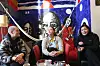 Leder Johanne Filipsen (tv), Martha-Marie Jensen og og Panéraq Rémy i opholdsstuen på Maskine-Maskine på Amager foran et af de smukke vægmalerier som brugerne har lavet.Foto: Trine Juncher Jørgensen
