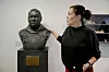 Vivian Motzfeldt lægger en hånd på skulpturen af Jonathan Motzfeldt. - Ham savner jeg. Han formåede at samle folk i stedet for at splitte, siger hun.Foto: Oscar Scott Carl