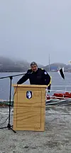 Claus i sit nuværende virke som chef for Grønlands Fiskeri- & Jagtkontrol, hvor han holder tale ved indvielsen af GFJK's nye kontrolbåd.Foto: Privat
