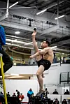 Steffen Knulst i den traditionelle arktiske disciplin One-Foot High Kick under Arctic Winter Games.Foto: Dida G. Heilmann