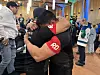 En rørt Minik Møller Platou krammer sin træner efter sin sejr.Foto: Hanna Hviid